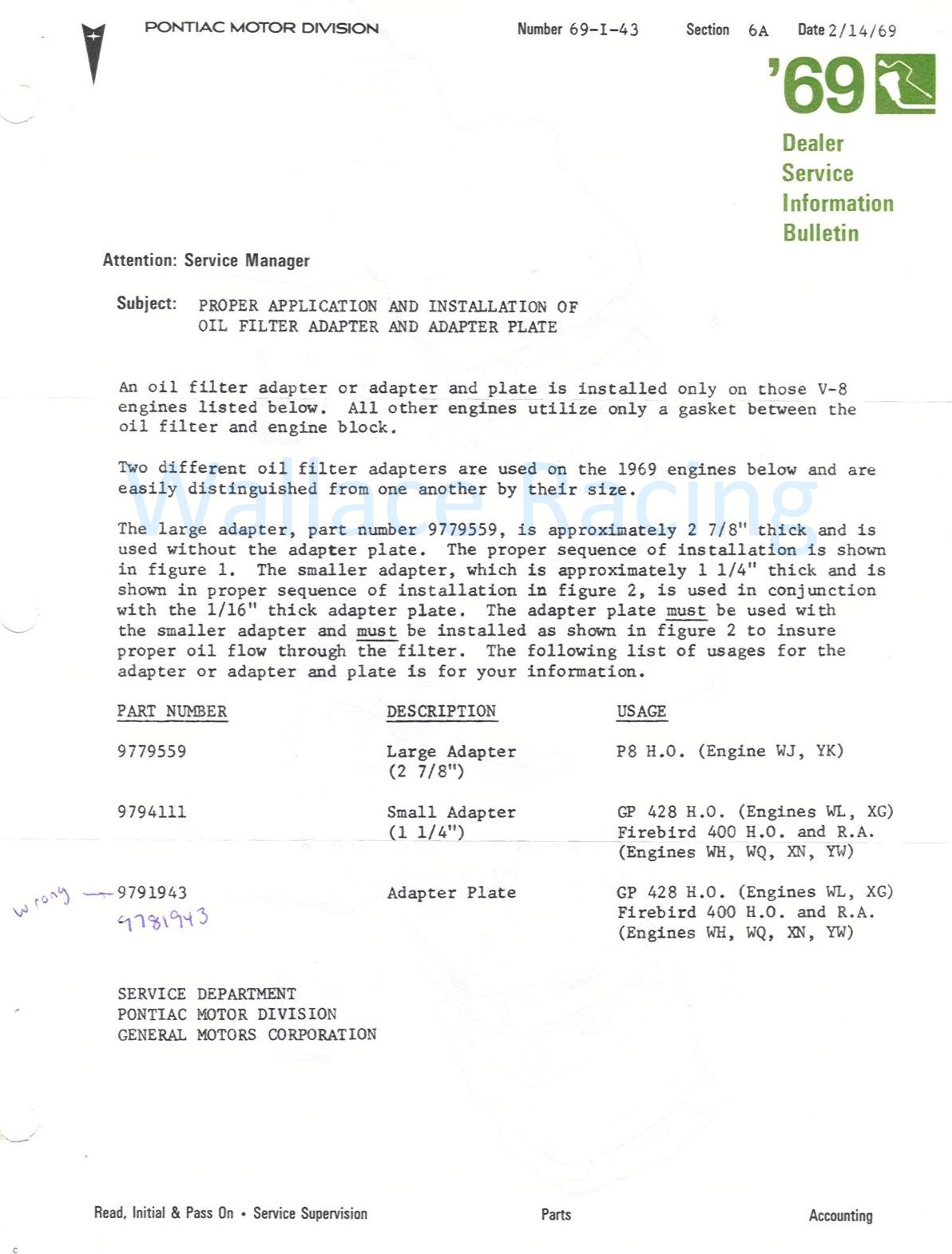 1969 Oil Filter and Plate Bulletin